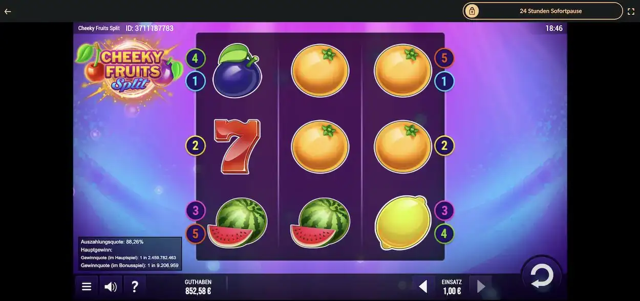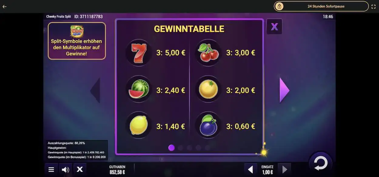 Du kannst Cheeky Fruits Split risikolos und gratis spielen und so die Features erkunden. Dafür aktivierst du die Demo-Version des Spiels. In dieser platzierst du deine Einsätze mit Spielgeld, das dir gratis zur Verfügung steht.