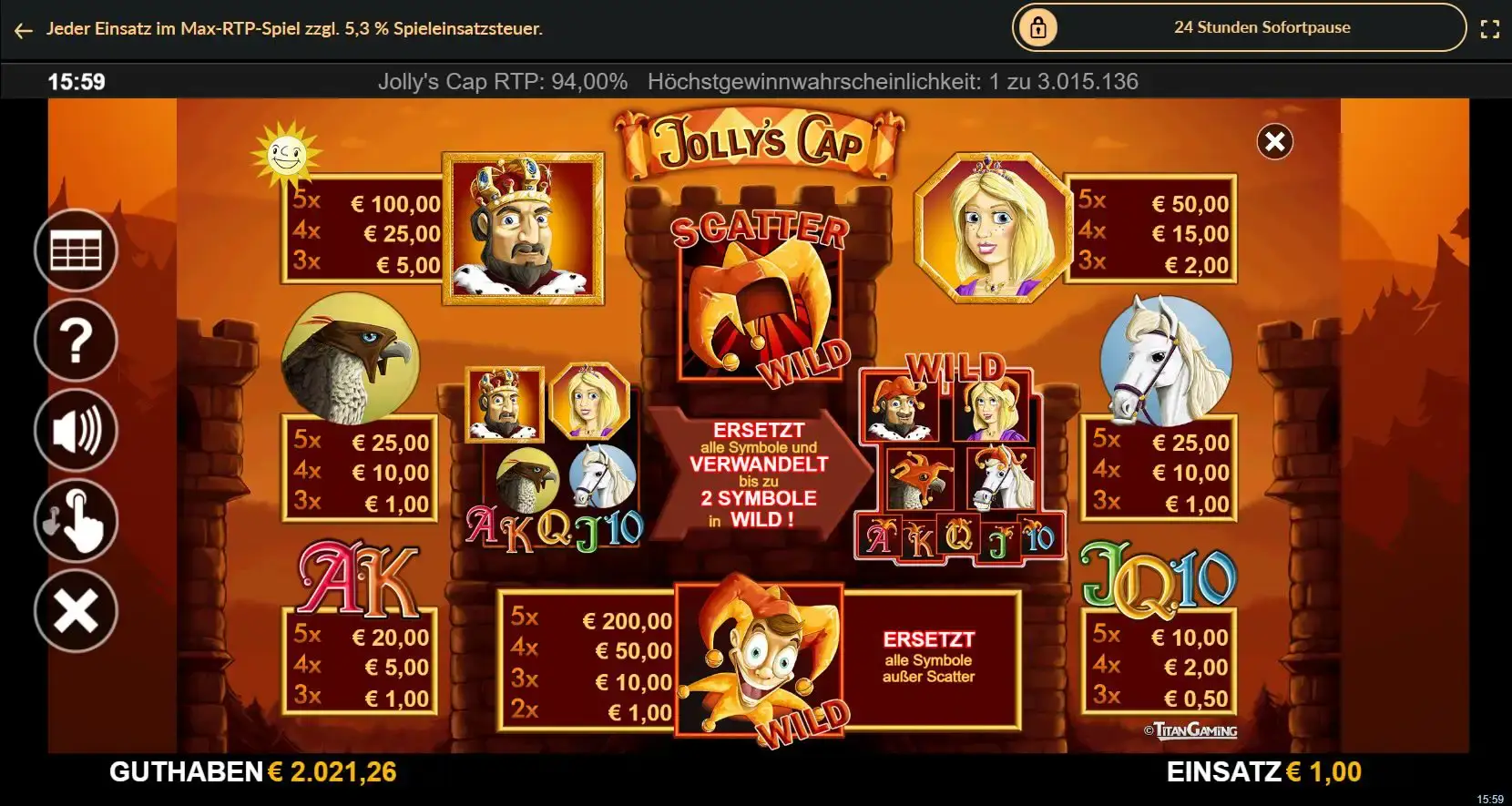 Als Sondersymbol tritt der Joker mit der Narrenkappe auf. Das Symbol kann als Wild-Symbol fehlende Symbole auf einer Gewinnlinie ersetzen. Zudem steht die Narrenkappe als Einzelsymbol zur Verfügung und kann mehrere Symbole in Wild-Joker verwandeln.