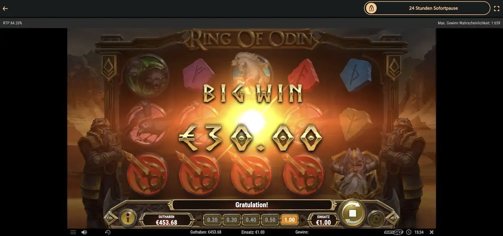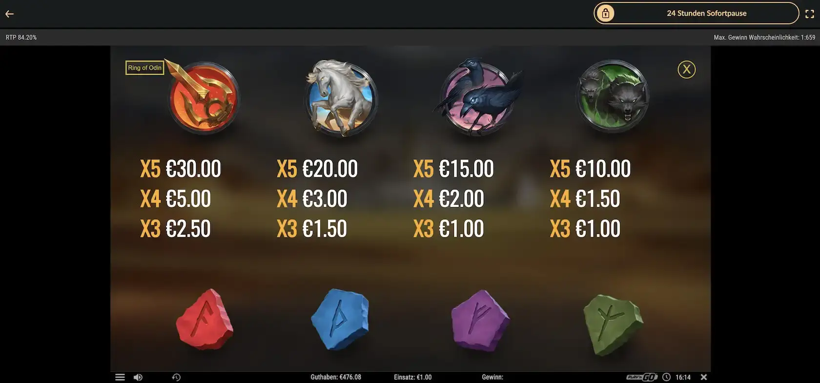 Der Book of Odin RTP (Auszahlungsquote) liegt bei 94,20 %. Auf lange Sicht werden somit 94,20 % der Spieleinsätze wieder als Gewinne an die Spieler ausgeschüttet. Zudem handelt es sich um einen Slot mit hoher Volatilität. Das bedeutet: Gewinne können etwas länger auf sich warten lassen, fallen im Durchschnitt aber höher aus.