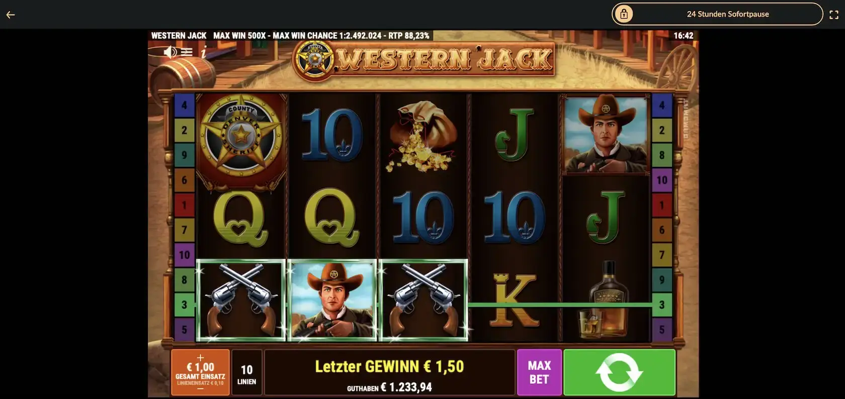 Für einen Gewinn benötigst du mehrere identische Symbole auf einer aktiven Gewinnlinie. Dabei spielst du Western Jack mit einer Auszahlungsquote von 88,23 %. Die Volatilität des Slots liegt auf einem hohen Niveau.